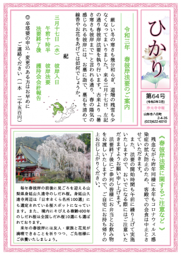 寺報発行のお知らせ イベント・活動 記事公開日:2021年03月01日 この記事は最終更新日から1年以上経過しています。記事の内容やリンク先については現在と状況が異なる場合がありますのでご注意ください。 2021年3月に発行した寺報第64号になります。 下記リンクよりPDFファイルをダウンロードしてご覧ください。 2021年3月号 この記事は最終更新日から1年以上経過しています。記事の内容やリンク先については現在と状況が異なる場合がありますのでご注意ください。 PREV NEXT 一覧へ