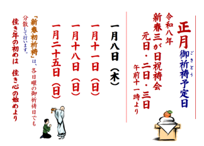 御祈祷予定日 ・1月元日(木) 新春三が日祝祷会 ・1月2…