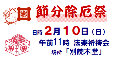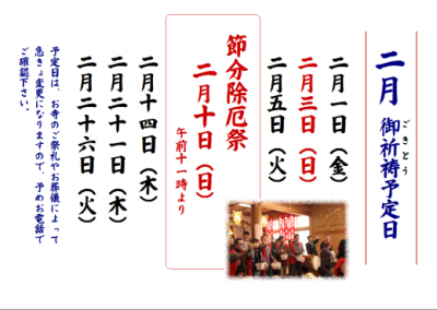 祈祷予定日 ・2月1日(金)夜間唱題行 ・2月5日(火) ・2月3日(日) ・2月10日(日)節分除厄…