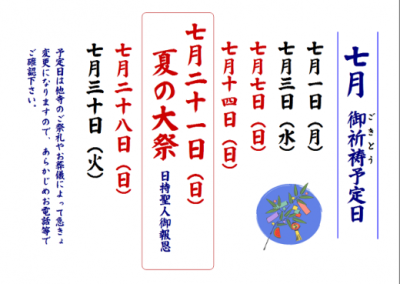 祈祷予定日 ・7月1日(月)夜間唱題行 ・7月3日(水) ・7月7日(日) ・7月14日(日) ・7月2…