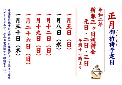 祈祷予定日 ・1月1日(水)新春祝祷会 ・1月2日(木) 〃 ・1月3日(金) 〃 ・1月5日(日) …