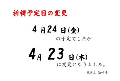令和2年4月祈祷予定日の変更 4月24日(金)で お知らせしていましたが 4月23日(木) に変更にな…