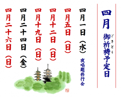 祈祷予定日 ・4月1日(水)夜間唱題行 ・4月5日(日) ・4月12日(日) ・4月19日(日) ・4月…