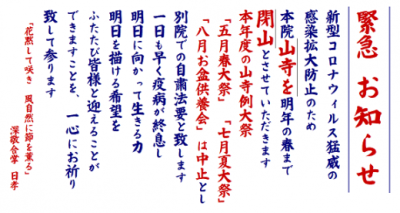 新型コロナウイルス(COVID-19)猛威の感染拡大防止のため、本院山寺を明年の春まで閉山とさせていただ…