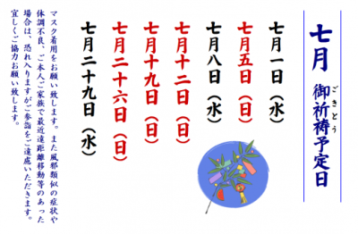※来寺なされる際は必ずマスクの着用をお願い致します。 祈祷予定日 ・7月1日(水)夜間唱題行 ・…