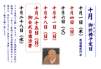 ※来寺なされる際は必ずマスクの着用をお願い致します。 祈祷予定日 ・10月1日(木)夜間唱題行 …
