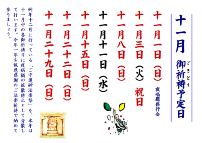 ※来寺なされる際は必ずマスクの着用をお願い致します。 祈祷予定日 ・11月1日(日)夜間唱題行 …