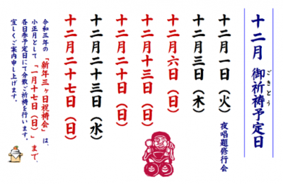 ※来寺なされる際は必ずマスクの着用をお願い致します。 祈祷予定日 ・12月1日(火)夜間唱題行 …