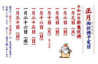 ※来寺なされる際は必ずマスクの着用をお願い致します。 御祈祷予定日 ・1月元日(土) ・1月2日…