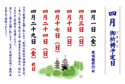 ※来寺なされる際は必ずマスクの着用をお願い致します。 御祈祷予定日 ・4月1日(金)夜間唱題行 …