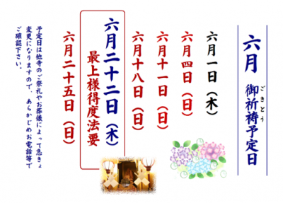 御祈祷予定日 ・6月1日(木)夜間唱題行 ・6月4日(日) ・6月11日(日) ・6月18日(日) ・6月…
