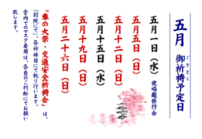 御祈祷予定日 ・5月1日(水)夜間唱題行 ・5月5日(日) …