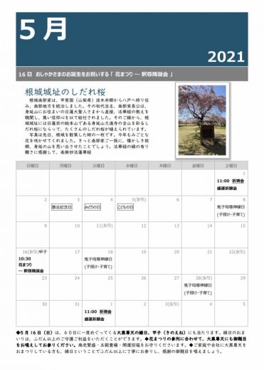 合掌 早いもので今年も3分の1が終わりました。 青葉の緑が目に映える5月。 今月の行事予定カレ…