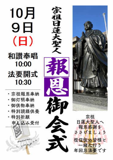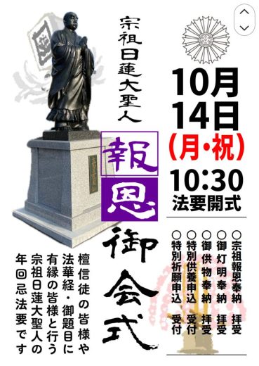 【10月14日 宗祖日蓮大聖人第743遠忌報恩御会式】 {{{**10月14日(月)午前1…