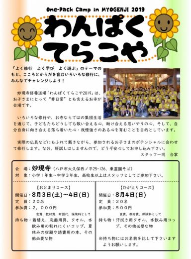 今年も元気いっぱいに開催します! 『わんぱくてらこや2019』 ☆おとまりコース 8月3日(土)A…