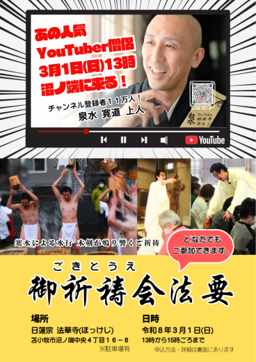 3月1日(日)、法華寺にて一年の無病息災や家内安全を願う「御祈祷会(ごきとうえ)」を開催しま…