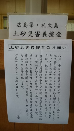 現在、当山では本堂と寺務所受付に募金箱を設置し、義援金を募っております。この義援金は日蓮宗北海道北部青年会を通じて、被害者への義援金として寄附させていただきます。