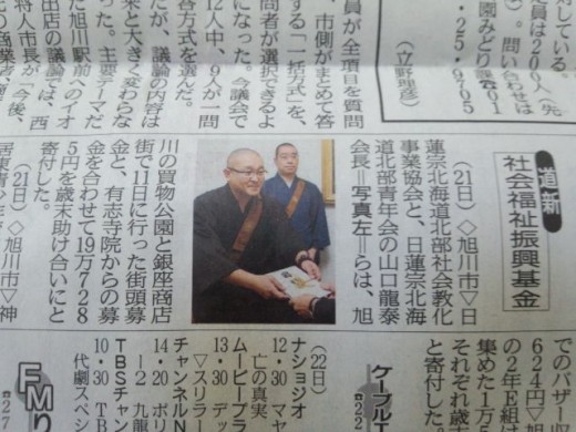 街頭での募金と各有志寺院での募金を合わせて197,285円を、北海道新聞社の社会福祉振興基金に寄託(新聞の写真は山口青年会長と鋤澤社教会事務局長)致しました。